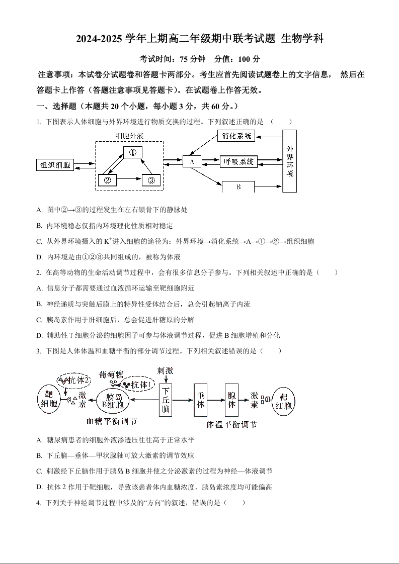 河南省郑州市十校联考2024-2025学年高二上学期11月期中考试生物(原卷版)