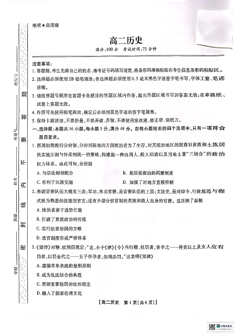 安徽省黄山市八校联考2024-2025学年高二上学期11月期中考试历史 PDF版无答案.