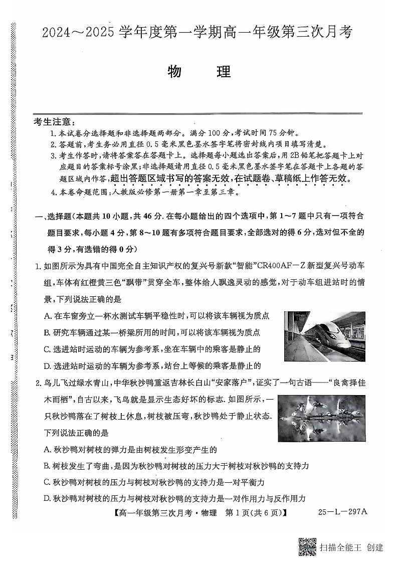 河北省联考2024-2025学年高一上学期11月第三次月考试题物理 PDF版含解析