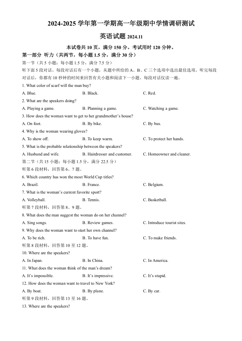 江苏省扬州市高邮市2024-2025学年高一上学期11月期中考试 英语答案