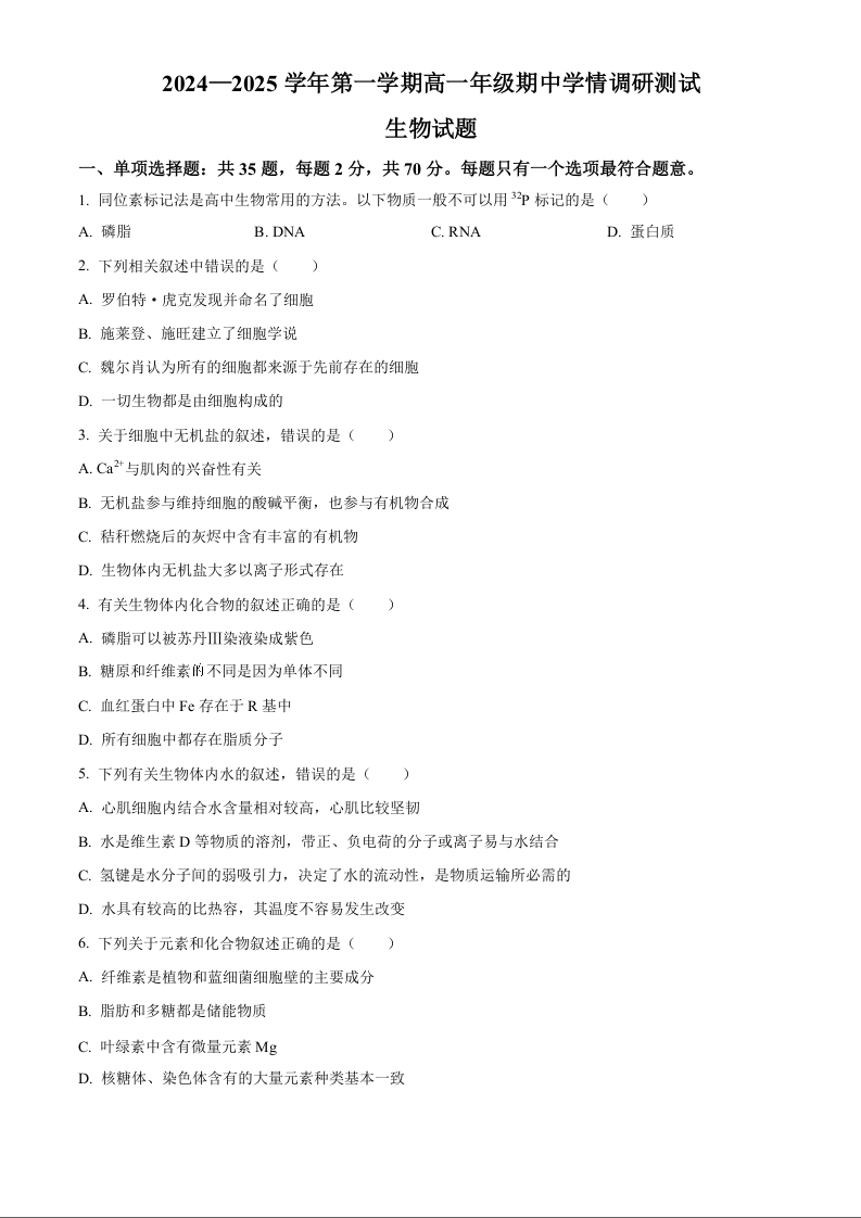 江苏省扬州市高邮市2024-2025学年高一上学期11月期中考试生物(原卷版)