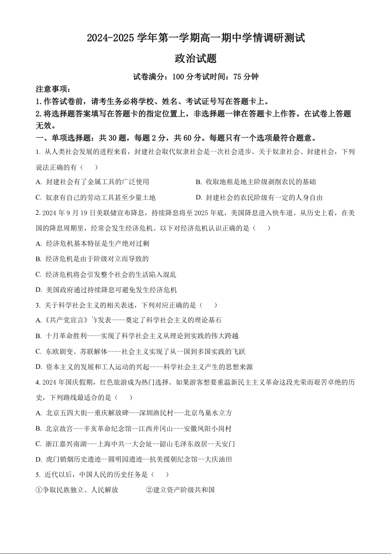 江苏省扬州市高邮市2024-2025学年高一上学期11月期中考试政治(原卷版)