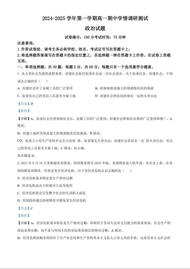 江苏省扬州市高邮市2024-2025学年高一上学期11月期中考试政治(精品解析版)