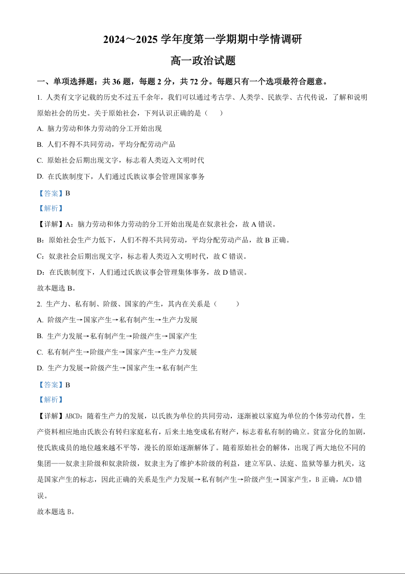江苏省徐州市铜山区2024-2025学年高一上学期11月期中考试政治(精品解析版)