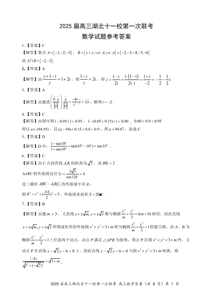 湖北省2025届高三十一校第一次联考数学答案