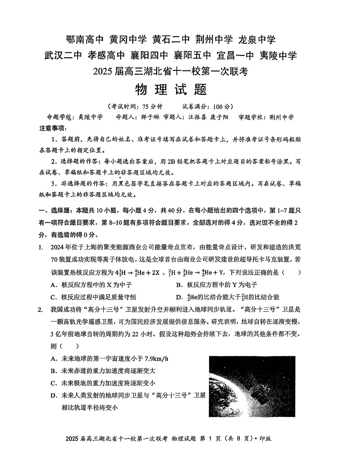 湖北省2025届高三十一校第一次联考物理