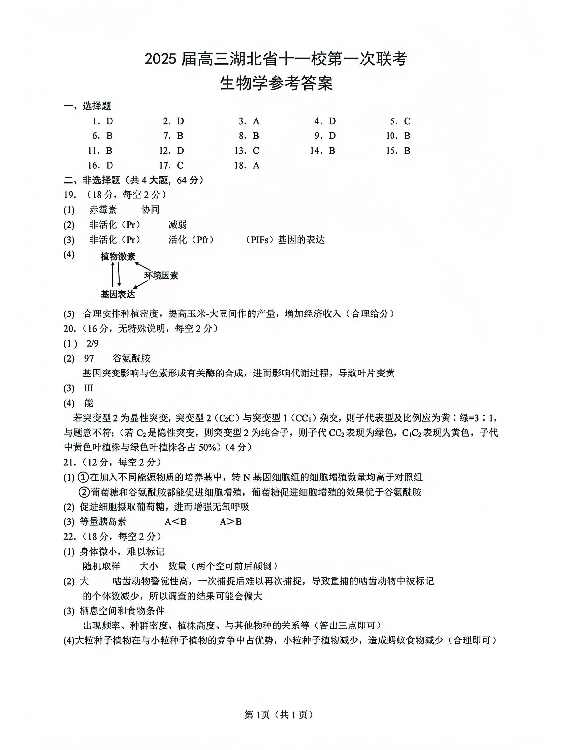 湖北省2025届高三十一校第一次联考生物答案