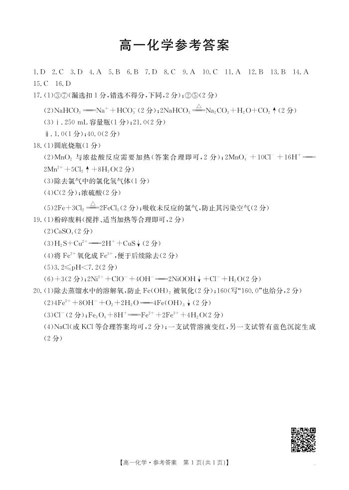 广东省佛山市H7联盟2024-2025学年高一上学期12月联考化学答案