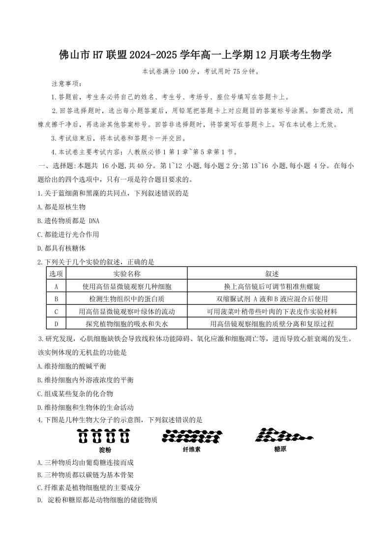 广东省佛山市H7联盟2024-2025学年高一上学期12月联考生物