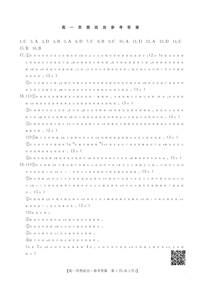 广东省佛山市H7联盟2024-2025学年高一上学期12月联考政治答案