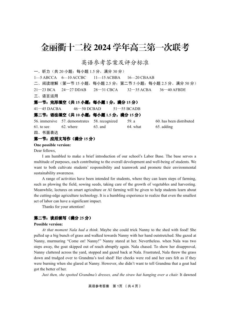浙江省金丽衢十二校2025届高三第一次联考英语答案