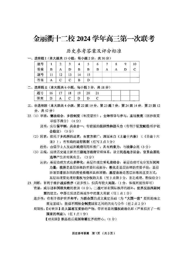 浙江省金丽衢十二校2025届高三第一次联考历史答案