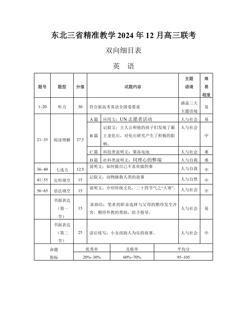 东北三省精准教学2025届高三上学期12月联考(强化卷)英语命题双向细目表