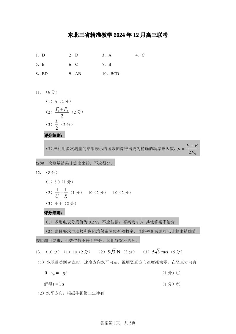 东北三省精准教学2025届高三上学期12月联考(强化卷)物理答案