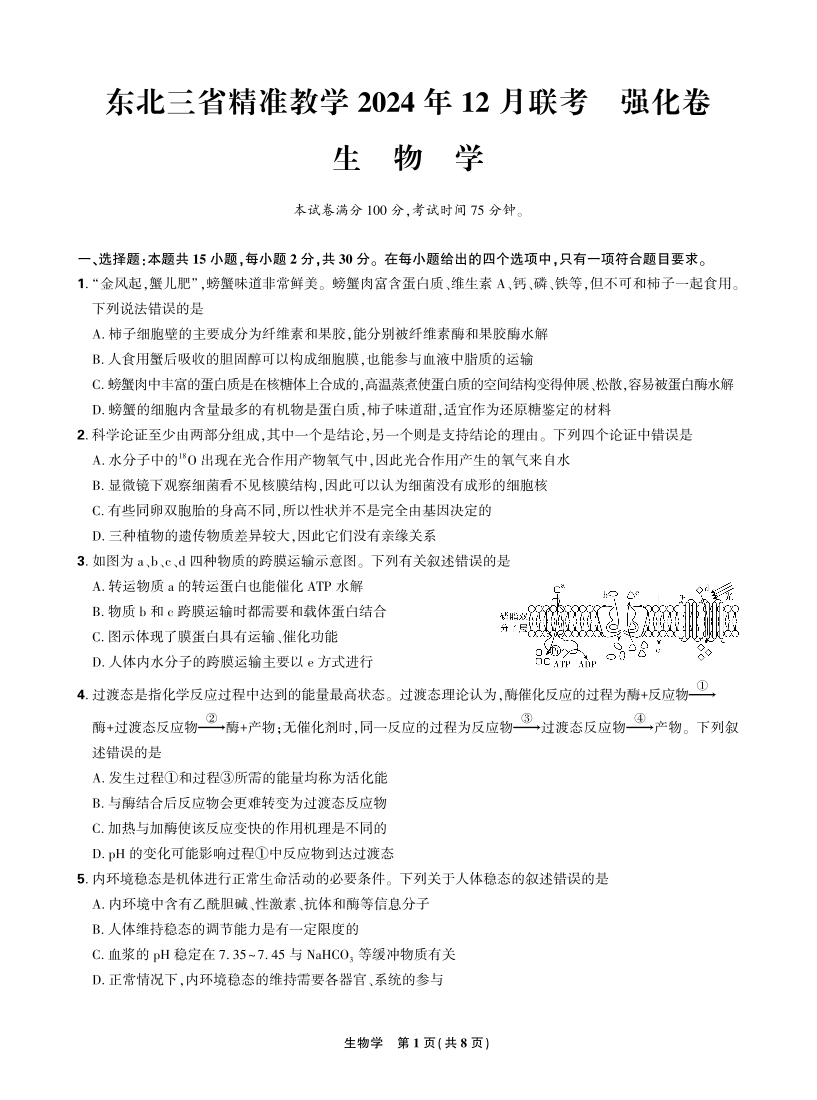 东北三省精准教学2025届高三上学期12月联考(强化卷)生物