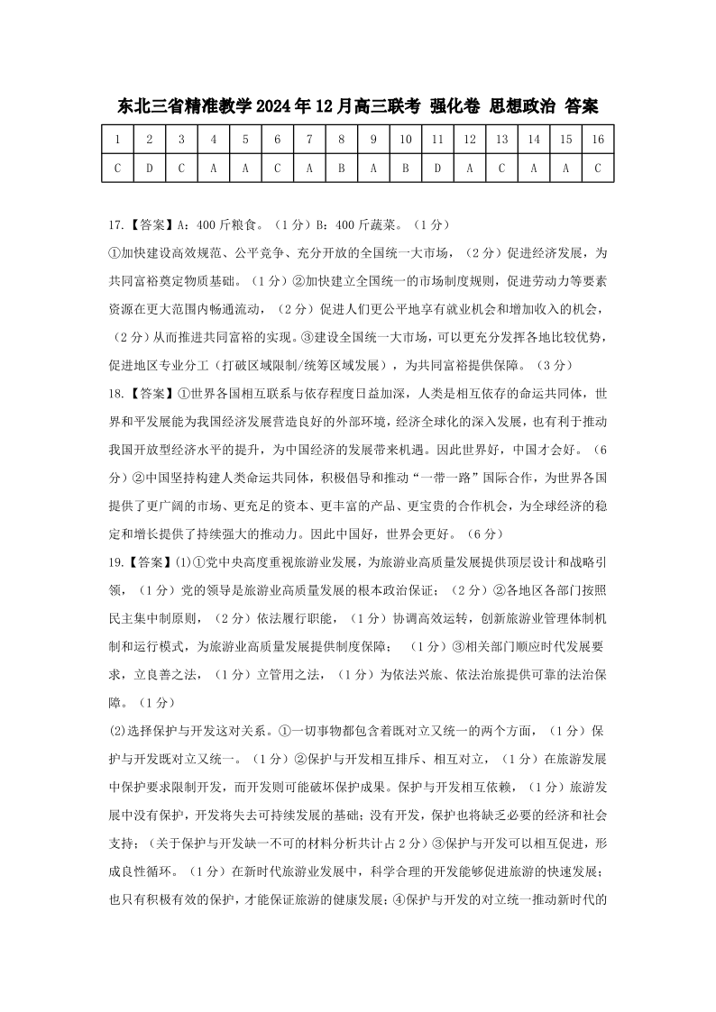 东北三省精准教学2025届高三上学期12月联考(强化卷)政治简版答案