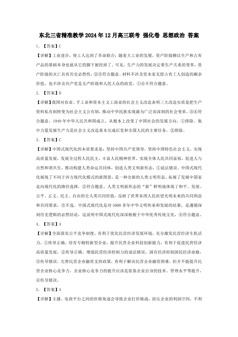 东北三省精准教学2025届高三上学期12月联考(强化卷)政治详解答案
