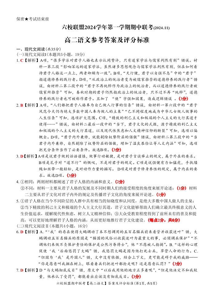 浙江省六校联盟2024-2025学年高二期中联考语文答案