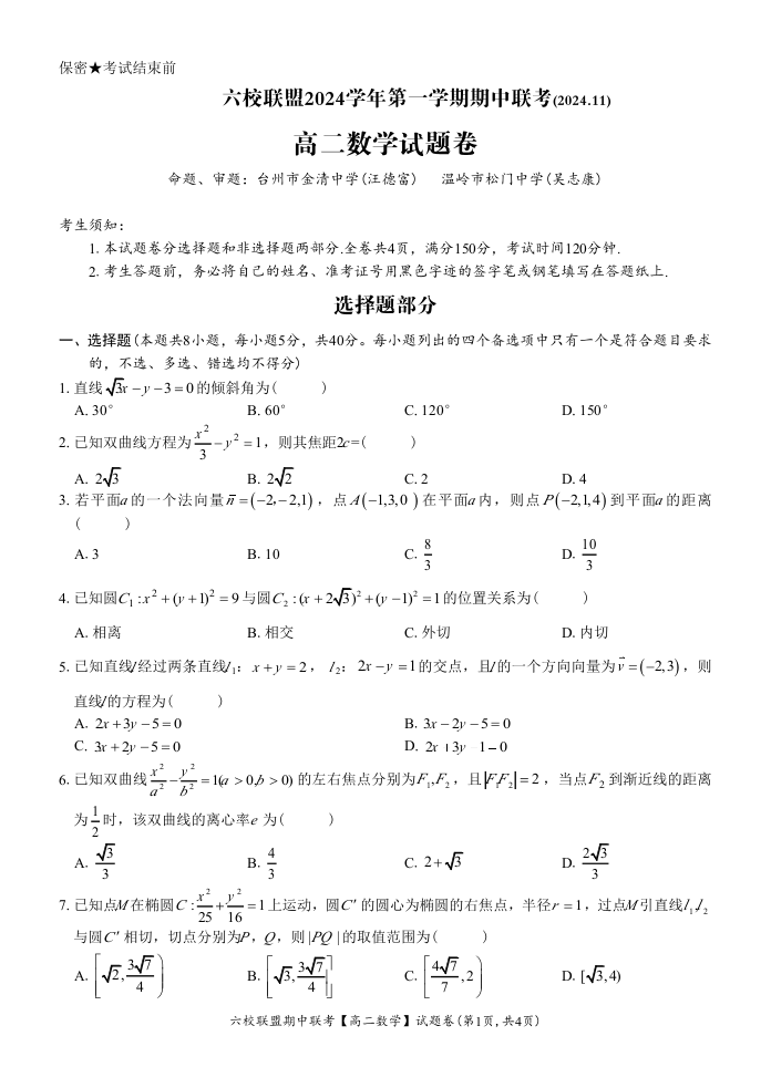 浙江省六校联盟2024-2025学年高二期中联考数学