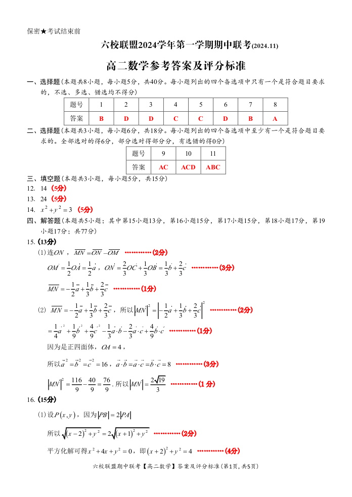 浙江省六校联盟2024-2025学年高二期中联考数学答案