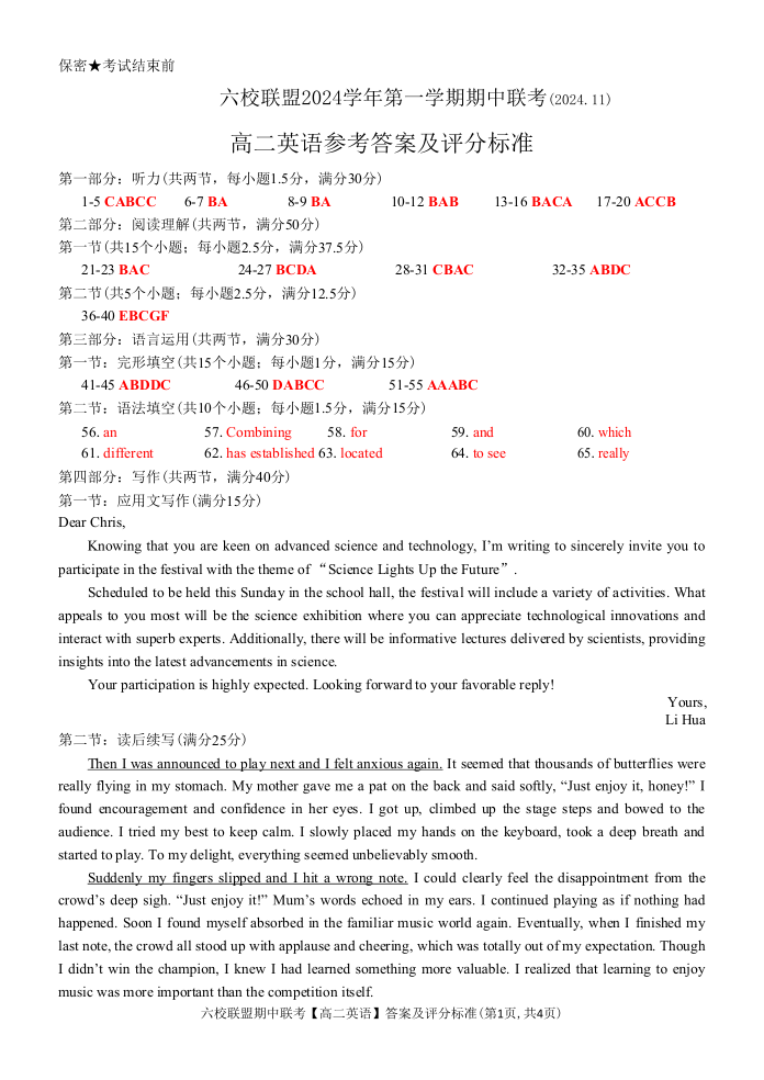 浙江省六校联盟2024-2025学年高二期中联考英语答案