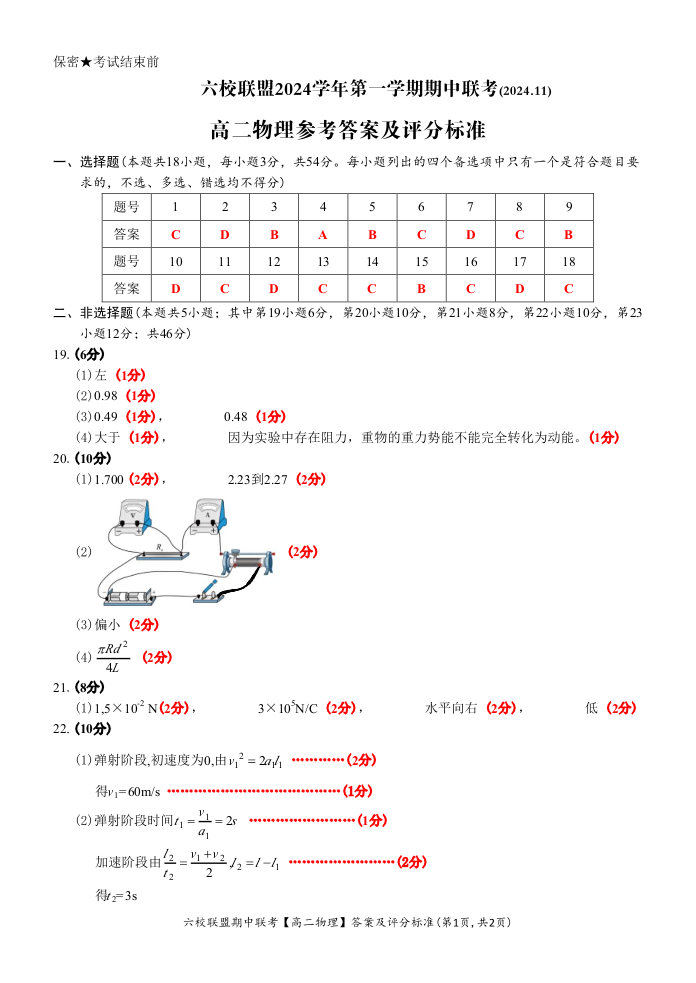 浙江省六校联盟2024-2025学年高二期中联考物理答案