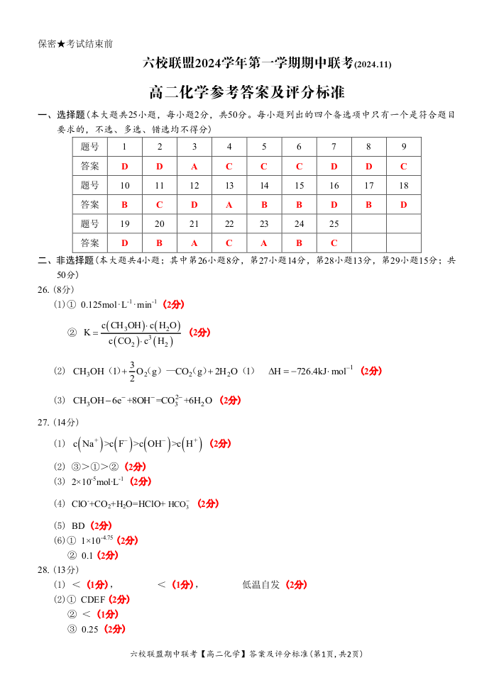 浙江省六校联盟2024-2025学年高二期中联考化学答案