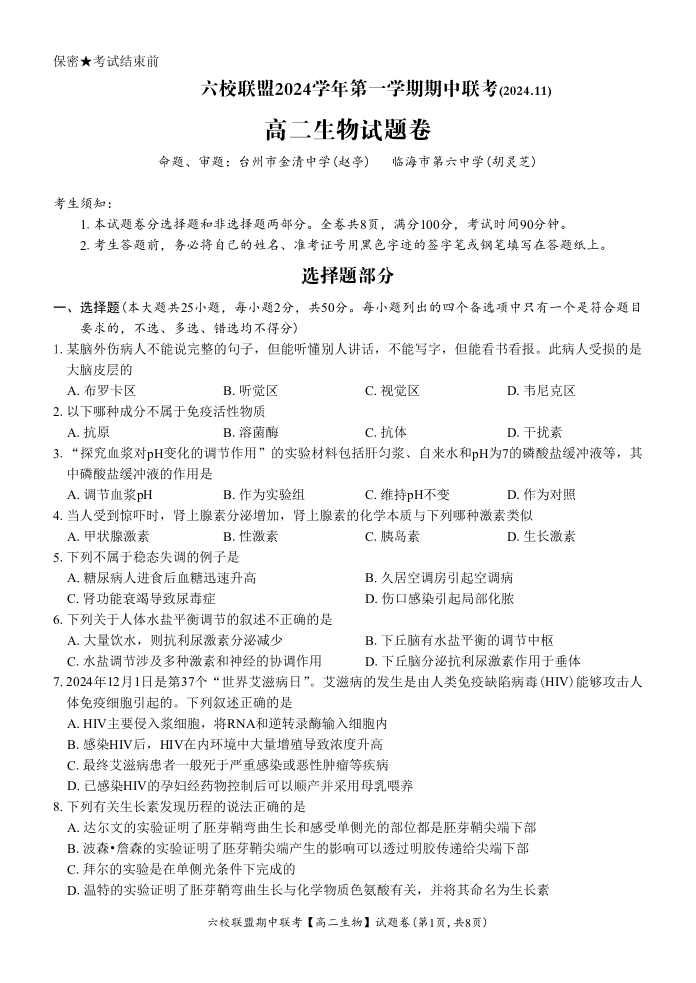 浙江省六校联盟2024-2025学年高二期中联考生物