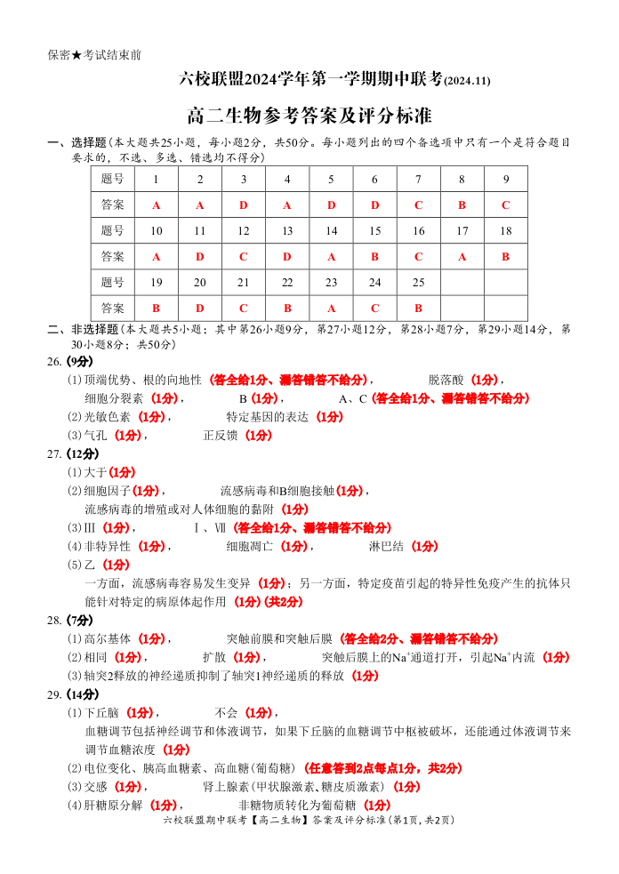 浙江省六校联盟2024-2025学年高二期中联考生物答案