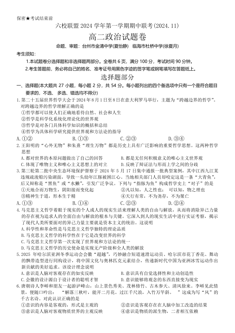 浙江省六校联盟2024-2025学年高二期中联考政治