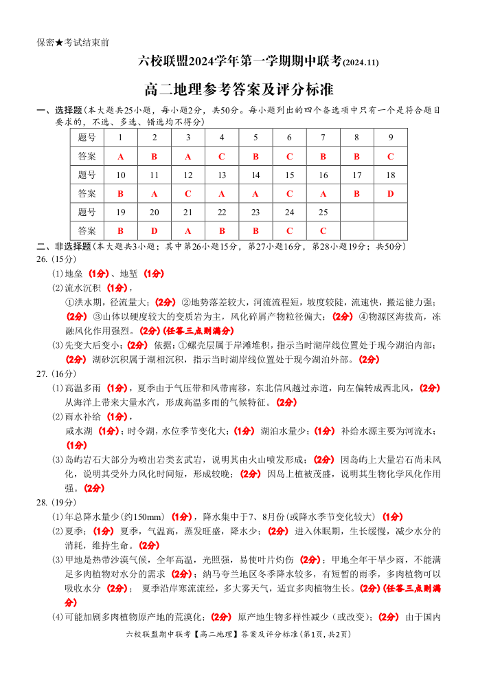 浙江省六校联盟2024-2025学年高二期中联考地理答案