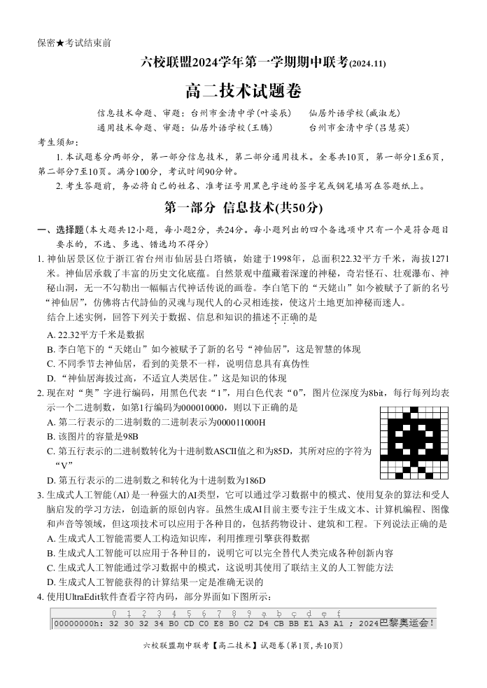 浙江省六校联盟2024-2025学年高二期中联考技术