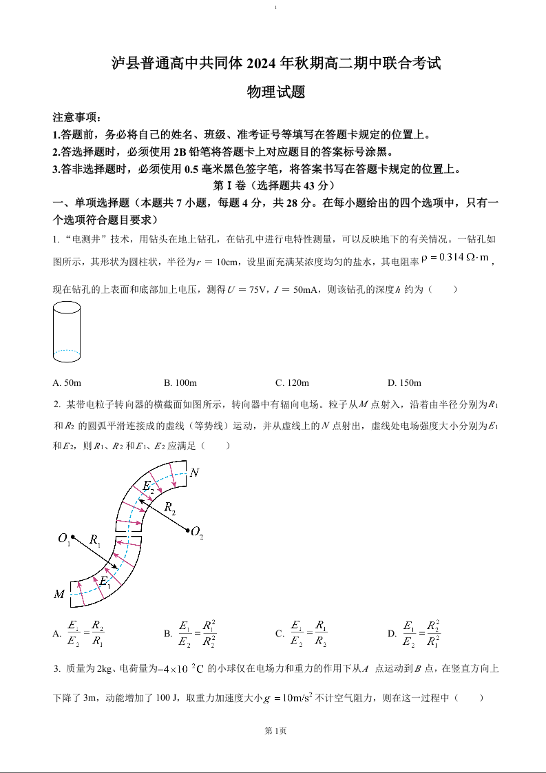 四川省泸州市泸县普通高中共同体2024-2025学年高二上学期11月期中考试物理Word版含答案