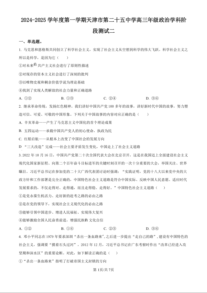 天津市第二十五中学2025届高三上学期第二次月考政治(原卷版)