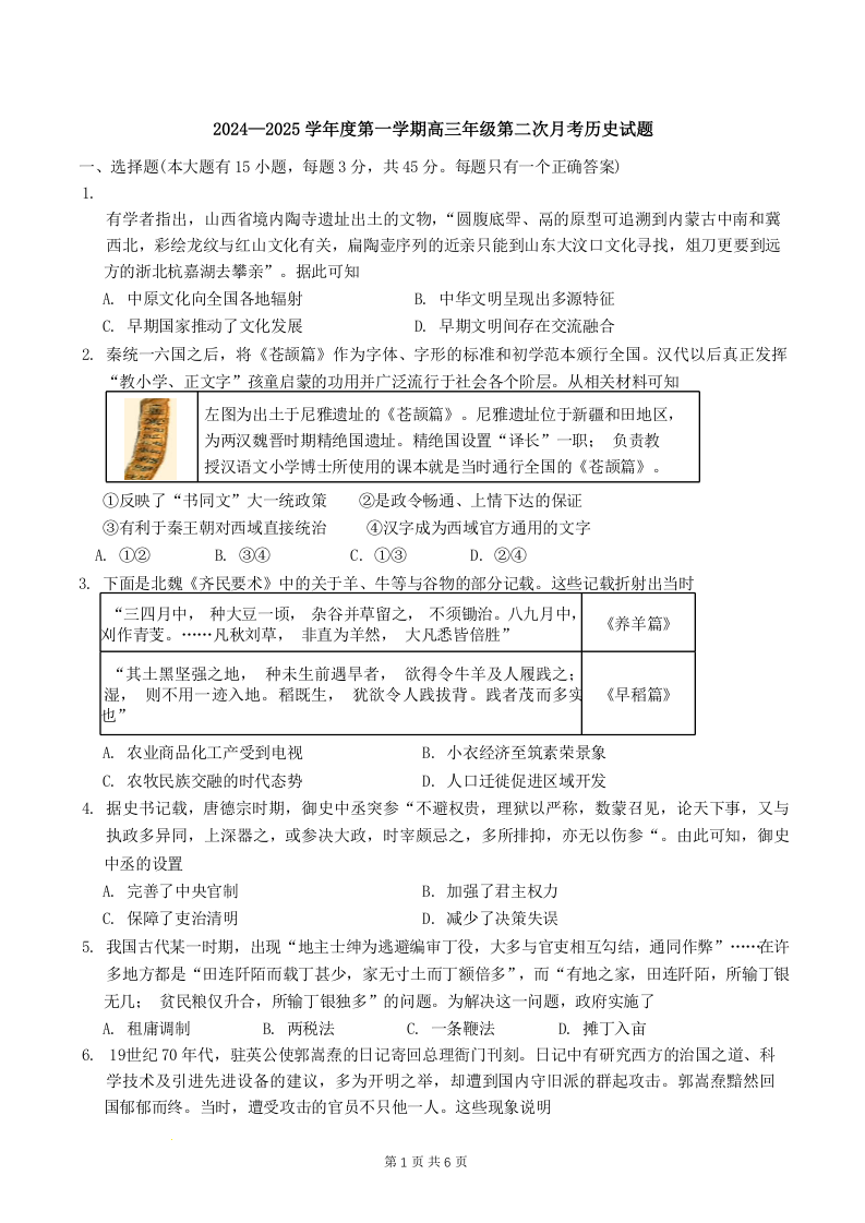 天津市第二十五中学2025届高三上学期第二次月考历史