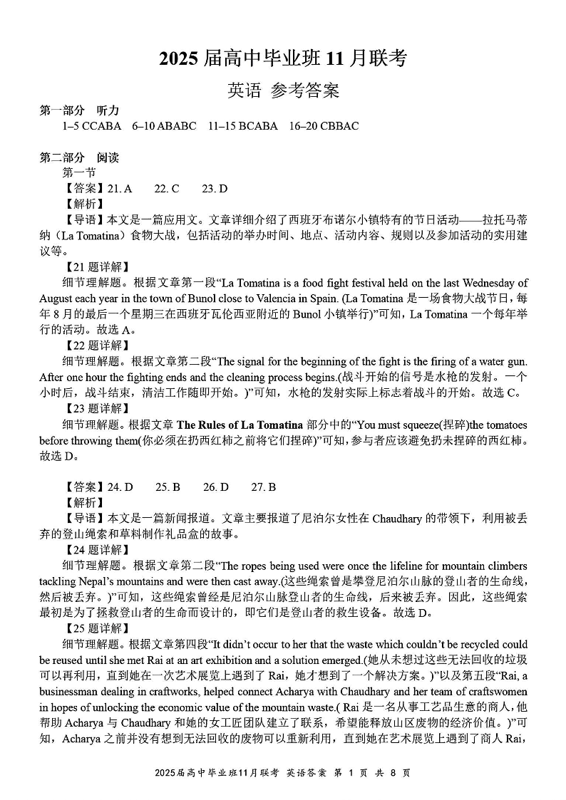 广西省新课程教研联盟2025届高三毕业班11月联考英语答案