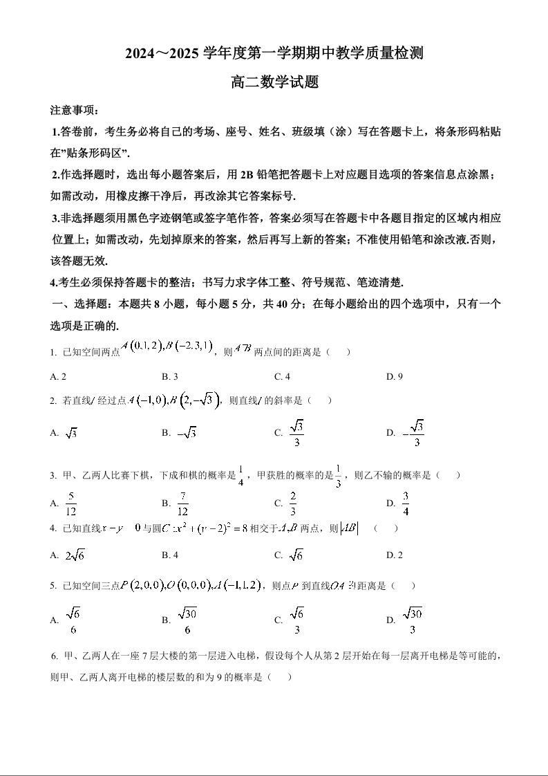 山东省济宁市邹城市2024-2025学年高二上学期11月期中考试数学(原卷版)