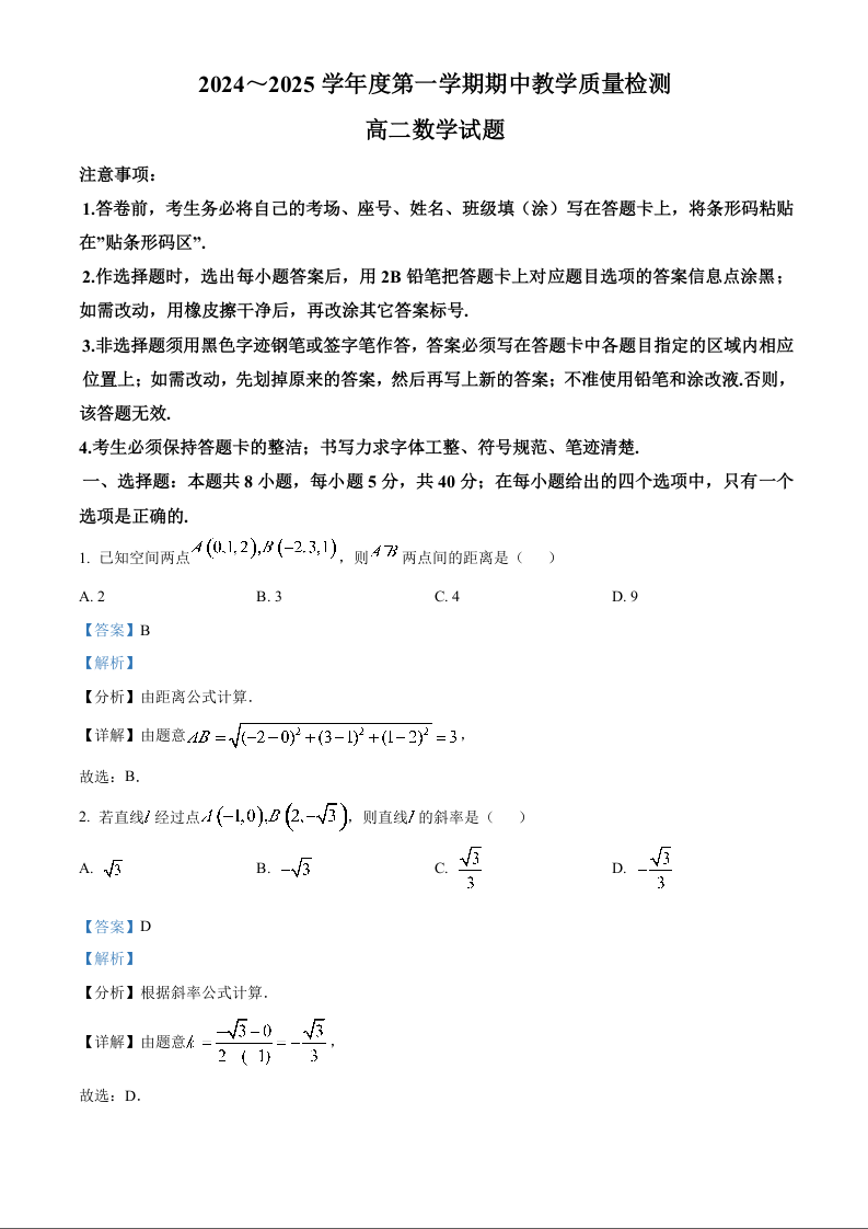 山东省济宁市邹城市2024-2025学年高二上学期11月期中考试数学(精品解析版)
