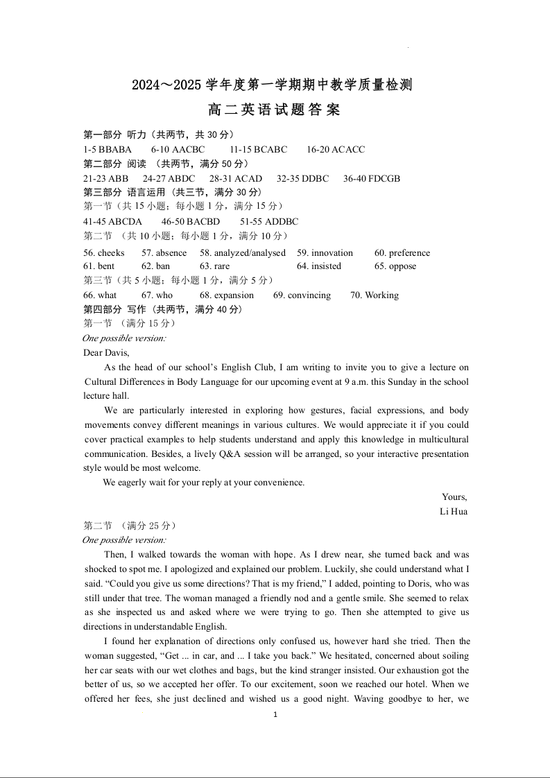 山东省济宁市邹城市2024-2025学年高二上学期11月期中考试英语答案