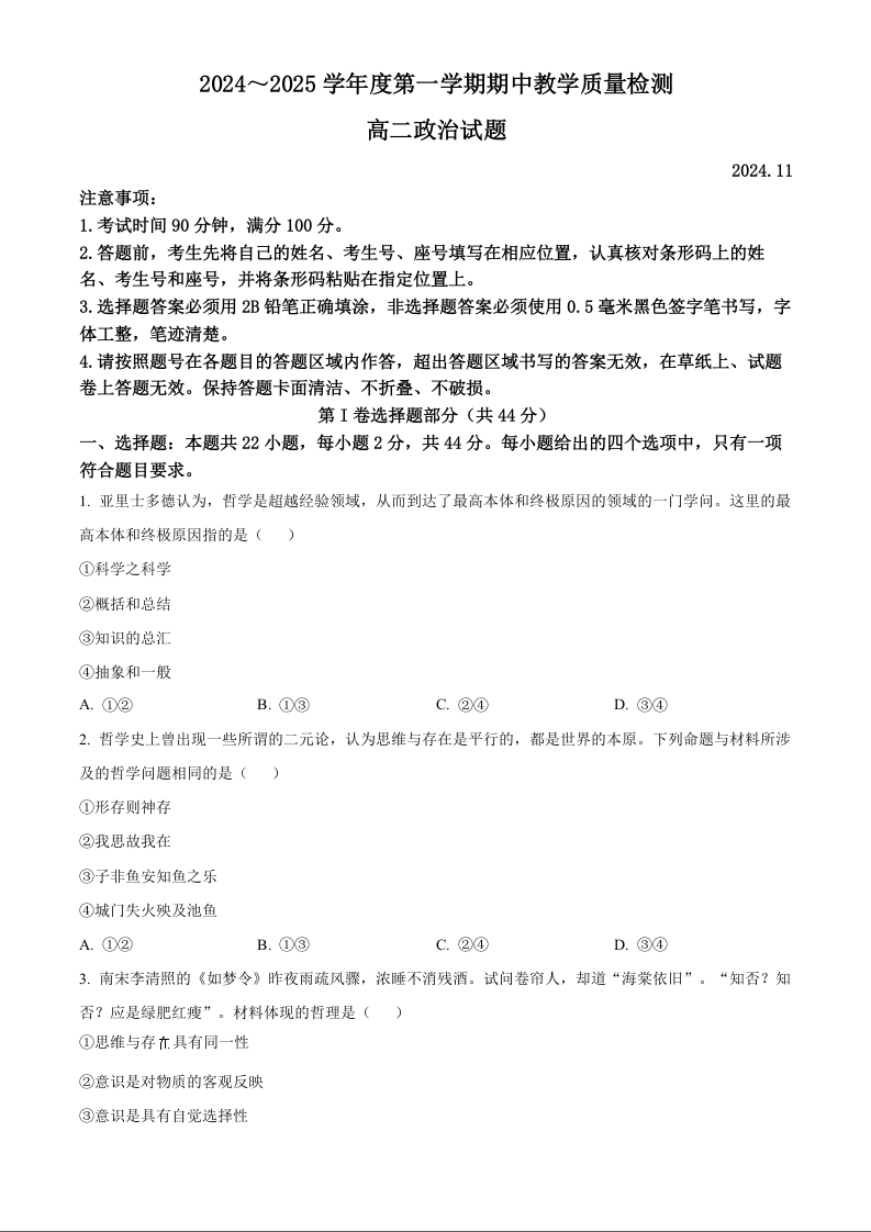 山东省济宁市邹城市2024-2025学年高二上学期11月期中考试政治(原卷版)