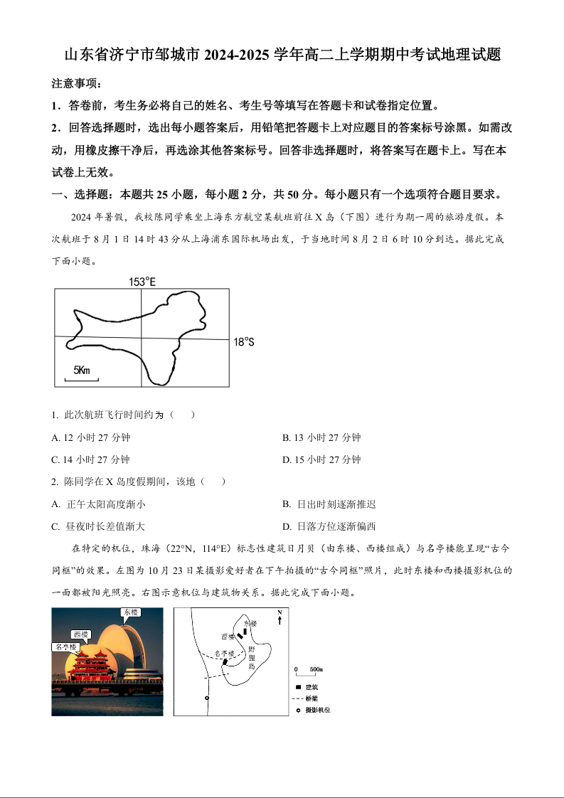 山东省济宁市邹城市2024-2025学年高二上学期11月期中考试地理(原卷版)