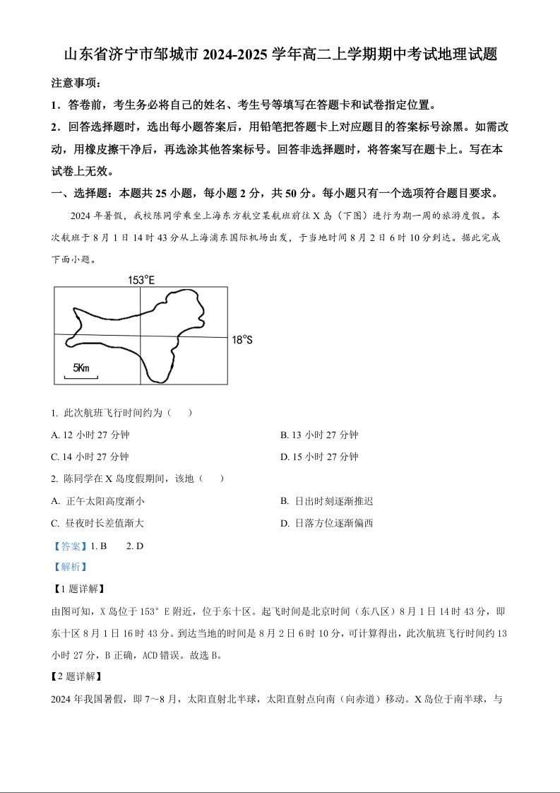 山东省济宁市邹城市2024-2025学年高二上学期11月期中考试地理(精品解析版)