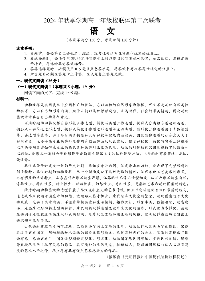 广西河池市2024-2025学年高一上学期12月联盟考试语文