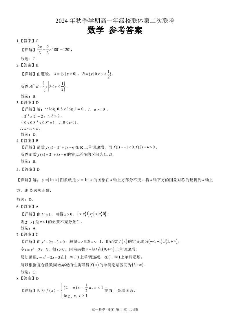 广西河池市2024-2025学年高一上学期12月联盟考试数学答案