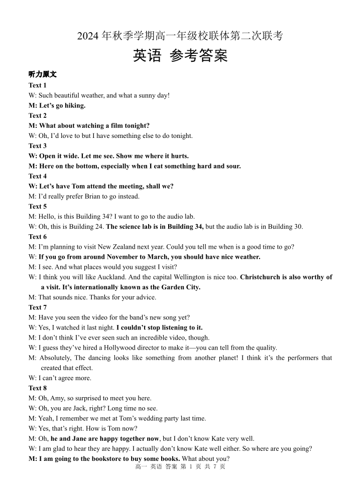 广西河池市2024-2025学年高一上学期12月联盟考试英语答案