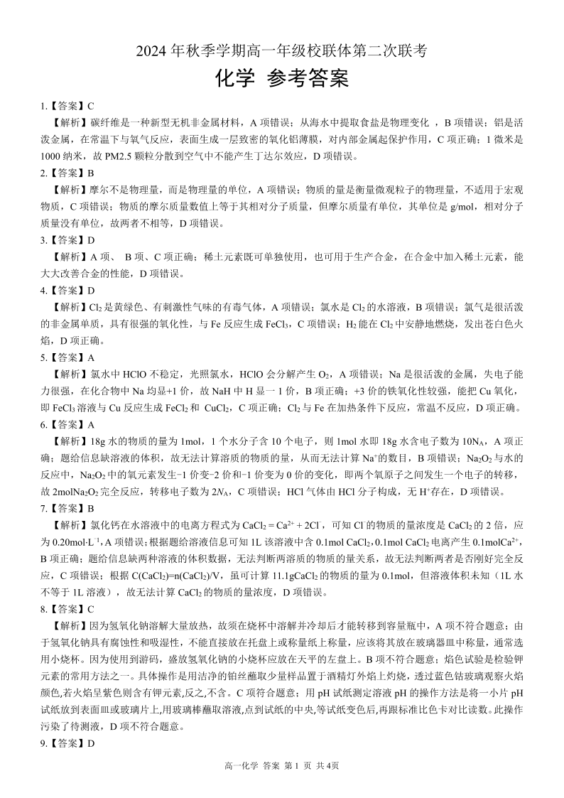 广西河池市2024-2025学年高一上学期12月联盟考试化学答案