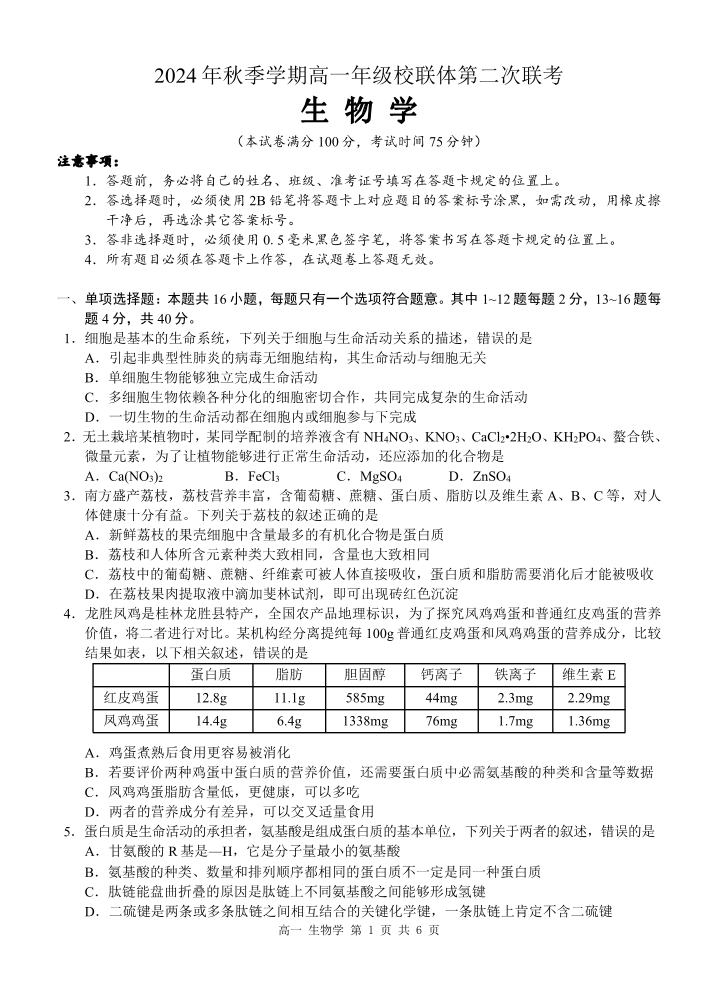 广西河池市2024-2025学年高一上学期12月联盟考试生物