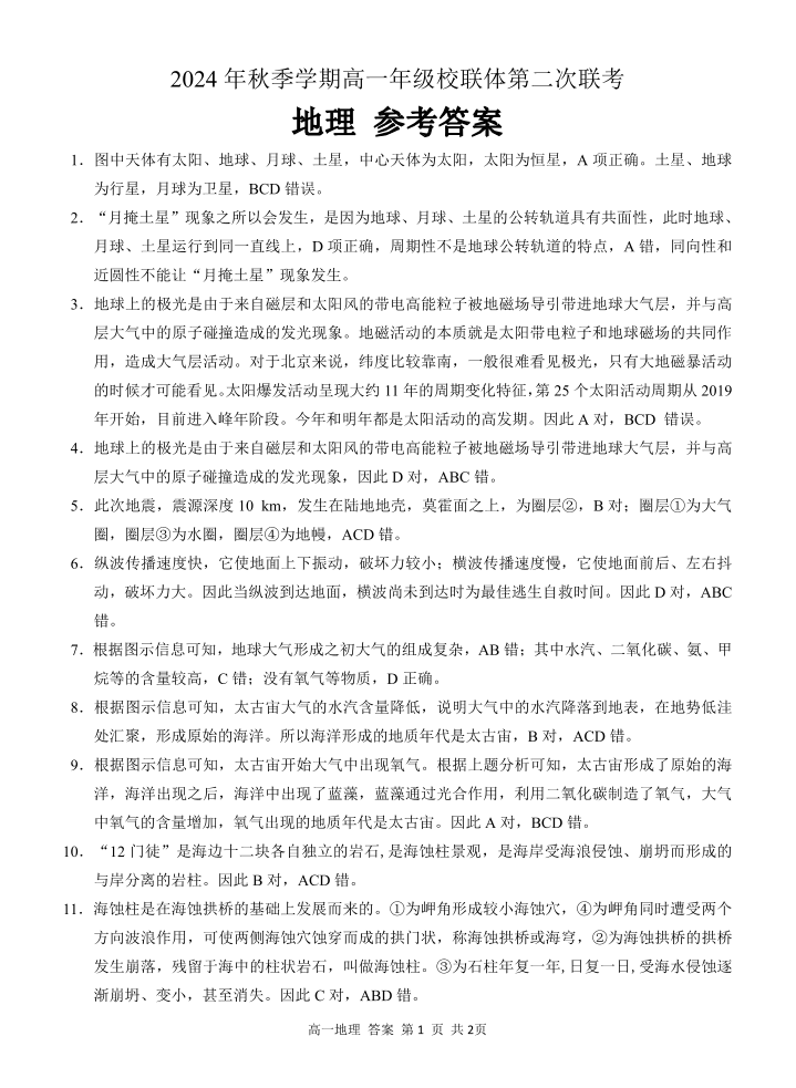 广西河池市2024-2025学年高一上学期12月联盟考试地理答案