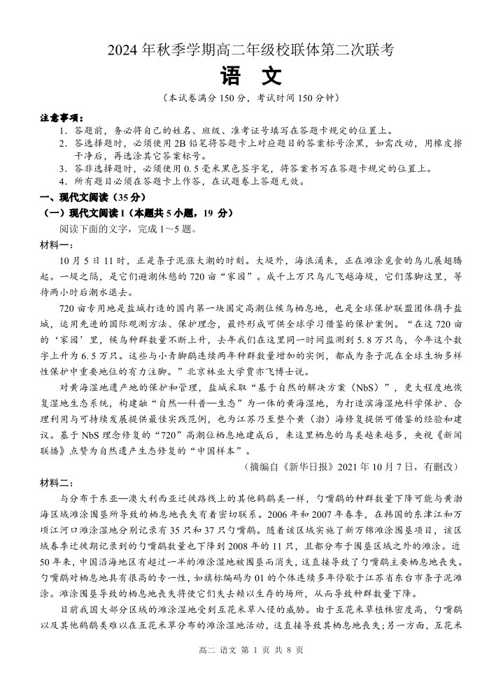 广西河池市2024-2025学年高二上学期12月联盟考试语文