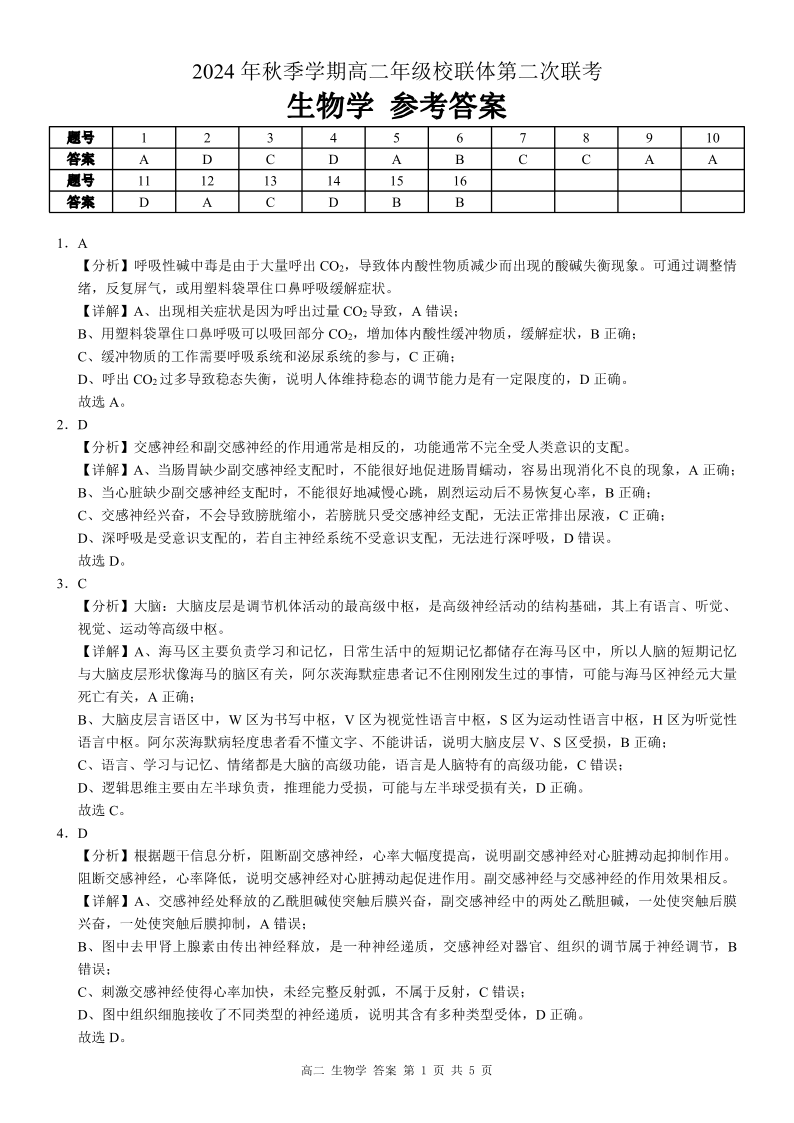 广西河池市2024-2025学年高二上学期12月联盟考试生物答案